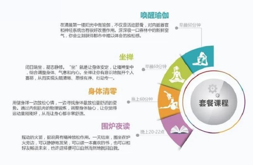 套餐課程:適用于所有到訪游客,根據住宿時間長短,基地會提供相應的健康管理課程,包括“坐禪、喚醒瑜伽、圍爐夜讀、健身球放松活動”等,套餐課程一般安排在早晚進行:早晨是心理調節課程、晚上是生理調節課程,時長基本為一小時左右(圍爐夜讀課程為兩小時)。