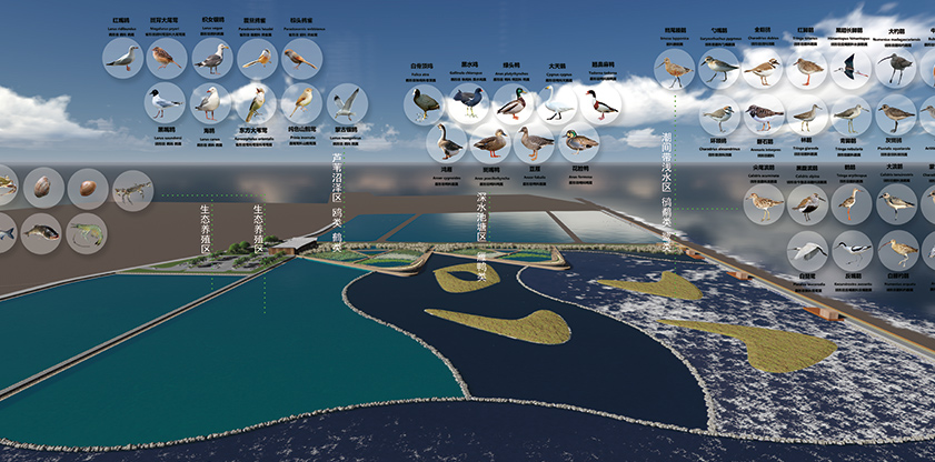 LOVE棲息地在潮間淺水區和深水區設計人工島棲息地,即水鳥高潮棲息地,棲息地通過不同水生池塘分為候鳥區和流鳥區,可容納恒魚類、鴨類、鷺類水鳥,保證全天候的觀鳥體驗。